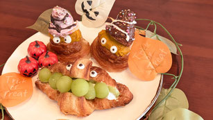 👻クロワッサンを4等分にし、端の二つは帽子に真ん中は体になります。