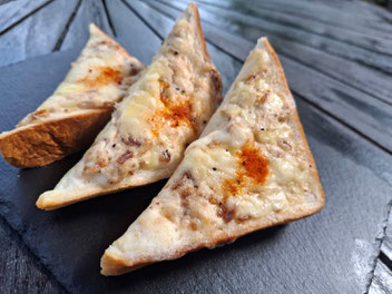 ツナとフライドオニオンとチーズをはさんだアメリカの朝の定番メニュー。焼き戻すとトロトロのチーズがたまらないホットサンド。